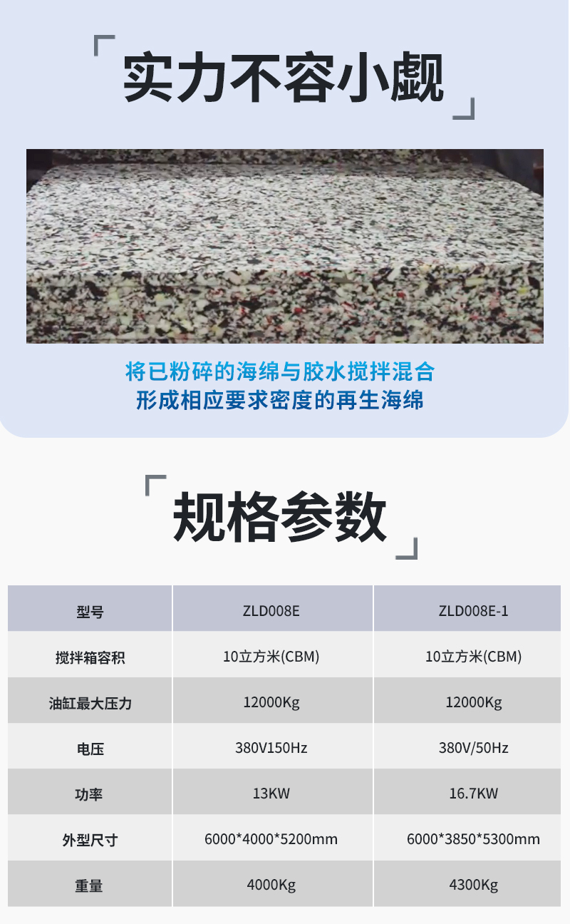 2.本機具有攪拌、混合、加壓成型的一整套流水生產(chǎn)線,生產(chǎn)效率真極高;與碎海綿機組合效果更佳。