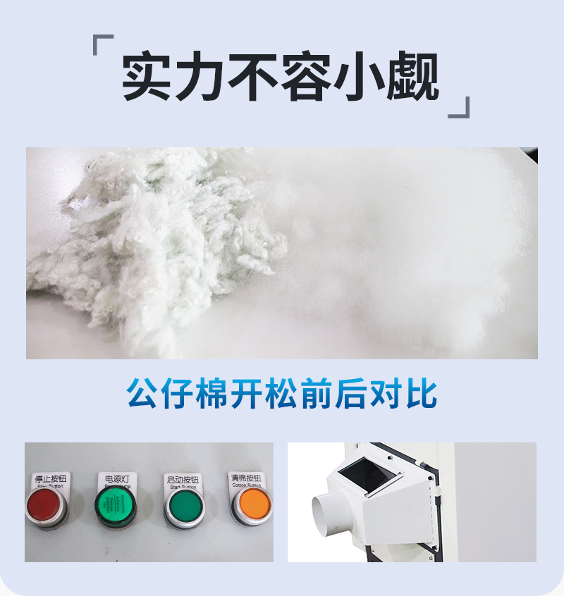 1.公仔棉開松機(jī)又名松棉機(jī),整機(jī)采用全封閉式,外形整齊美觀大方,自帶保護(hù)裝置,操作簡(jiǎn)單安全可靠,吊運(yùn)安裝方便。