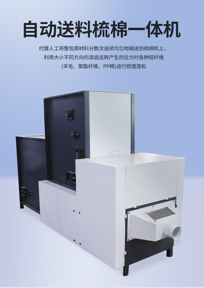 2.利用大小不同方向的滾齒運(yùn)轉(zhuǎn)產(chǎn)生的拉力對(duì)各種短纖維(羊毛、聚酯纖維PP棉)進(jìn)行梳理蓬松,開松率達(dá)99%以上;