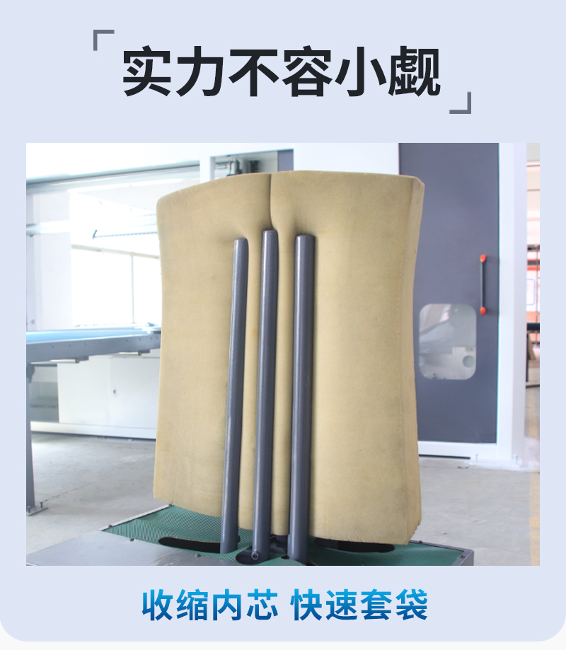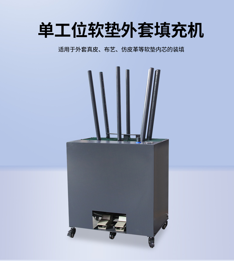 1.軟墊外套填充機適用于小型軟墊外套真皮、布藝、仿皮革等軟墊內(nèi)芯的裝填, 針對于人工套袋費時費力而且套袋效果不平整的情況下,這款機器解決了以上難點。 2.整機操作簡單便捷,操作步驟: 放置小軟墊,收縮夾桿夾緊軟墊,套袋,氣缸頂出完整套袋。 3.此款機器適用于小型纖維棉或者海綿軟墊,因其實用以及經(jīng)濟性廣受好評。