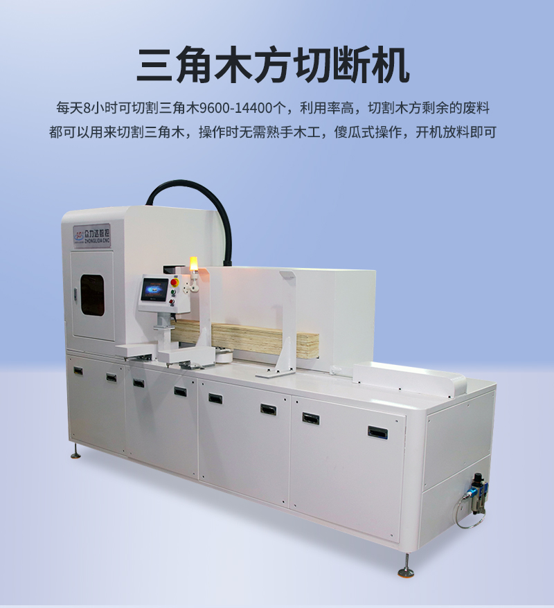 1.三角木方切斷機,整機采用全封閉式,外形整齊美觀大方,自帶保護裝置,操作簡單安全可靠,吊運安裝方便。