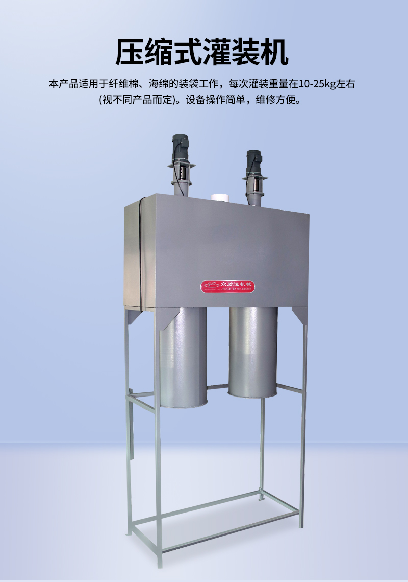1.灌裝機適用于纖維棉、海綿的裝袋工作,每次灌裝重量在10-25kg左右(視不同產(chǎn)品而定)。