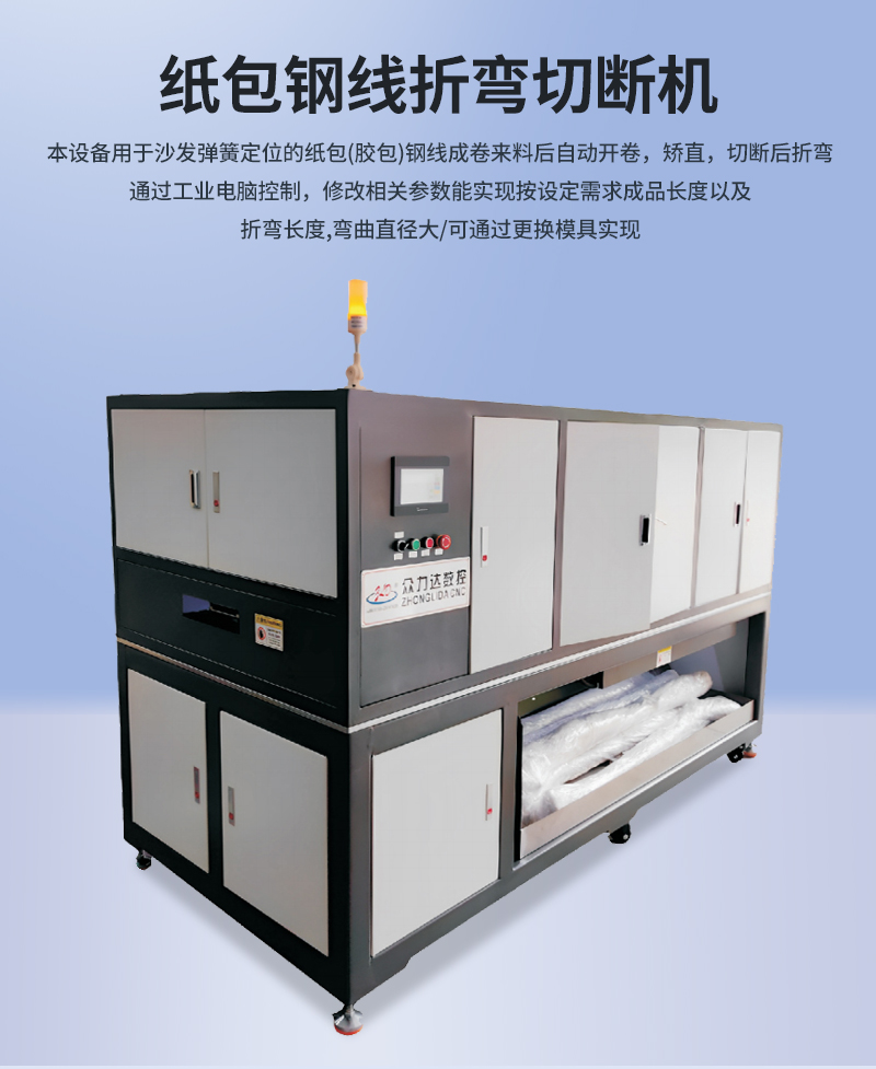1.該設(shè)備主要用于沙發(fā)廠紙包鋼絲(膠包鋼絲)的自動切斷折彎,實現(xiàn)多線同步自動送料,精度高、操作簡單。